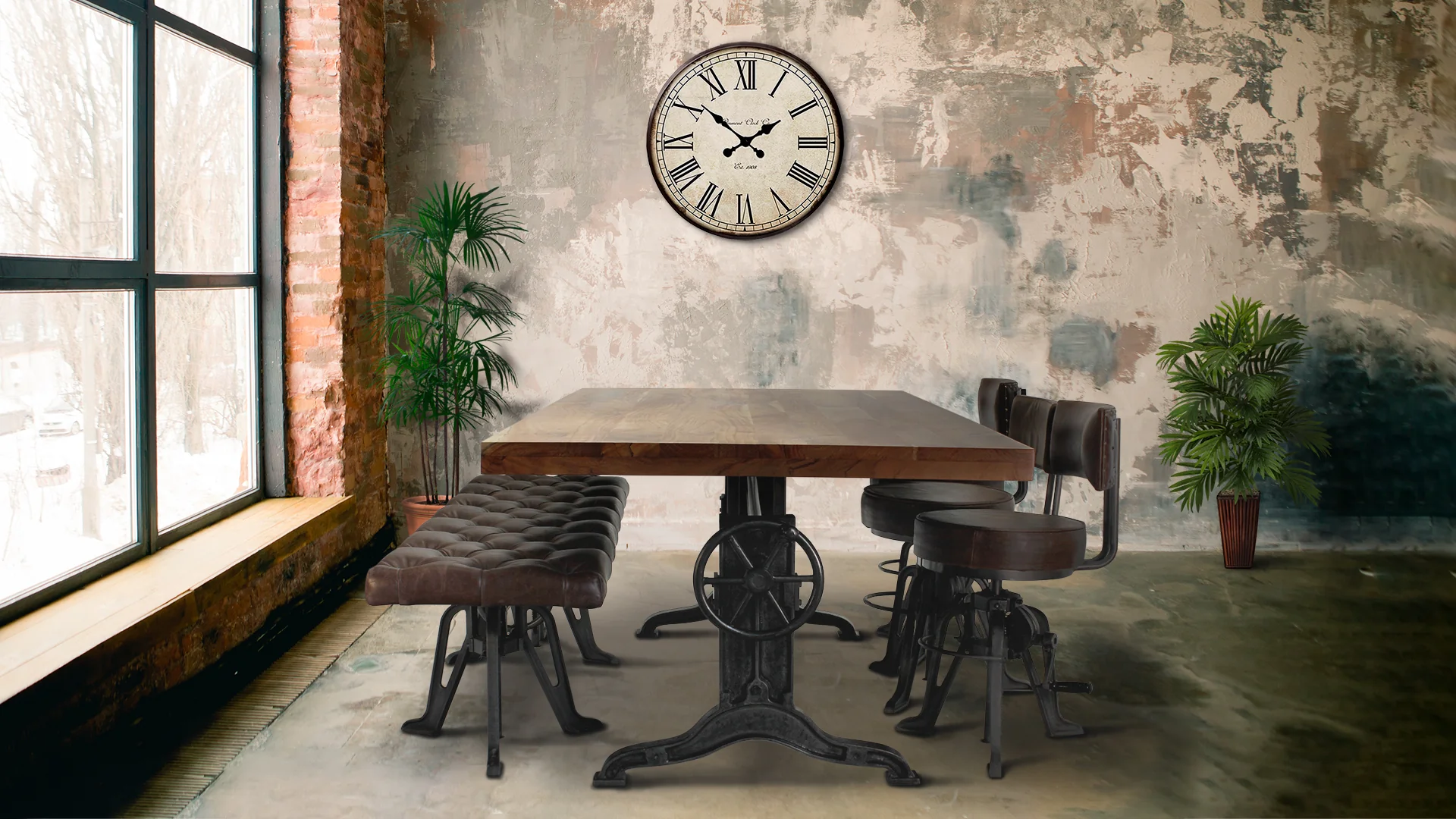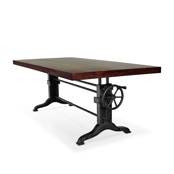 The Frederick industrial-style table features a heavy cast iron base that adjusts from standard dining height up to bar height. This very robust design is multi-functional as a dining table, pub table, counter height kitchen island, writing table, or desk. This elegant industrial base sits sturdily under a solid hardwood top with a healthy 2.5-inch-thick trim in a smooth walnut finish.