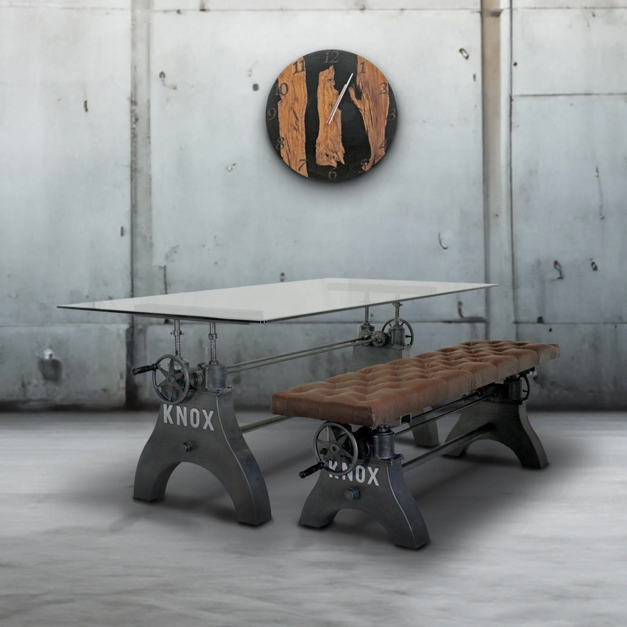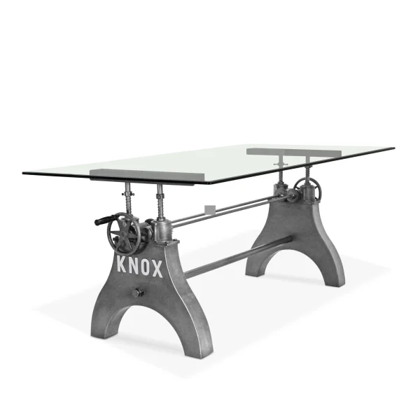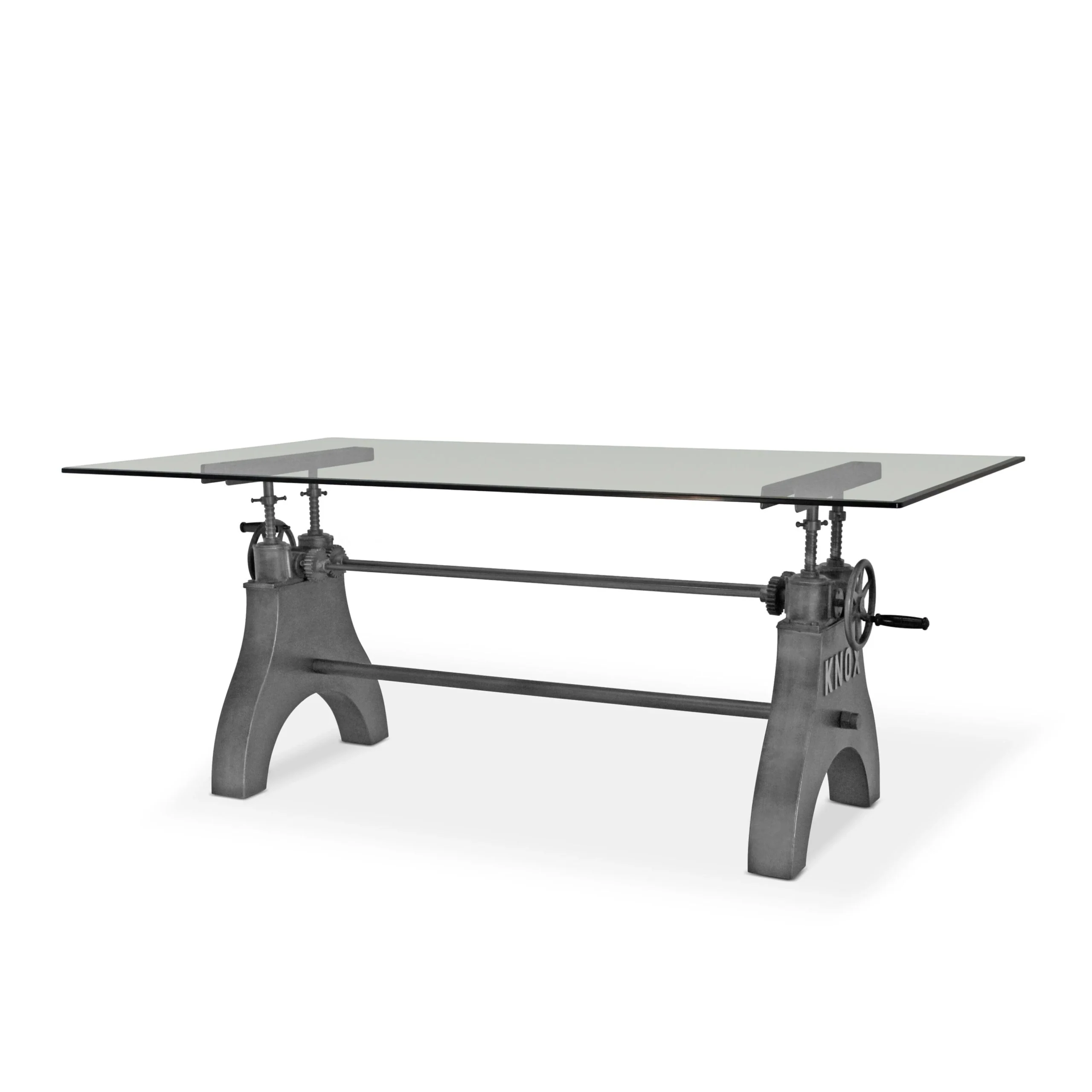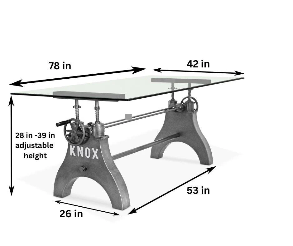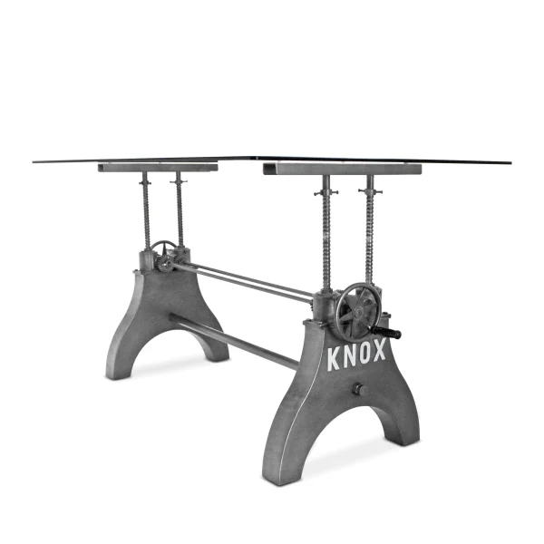 No matter the dining situation, this beautifully designed industrial table will fill the need. Our KNOX dining table has a hand-crank iron wheel allowing you to move the massive steel tabletop effortlessly through a 10-inch range, from standard dining height all the way to counter or bar pub height.