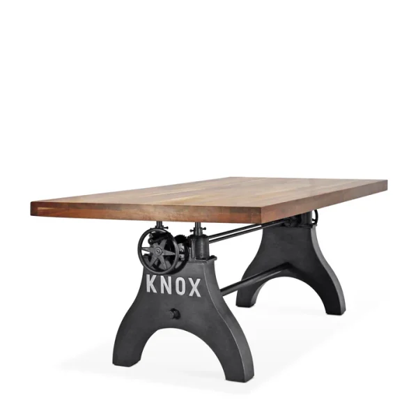 No matter the dining situation, this beautifully designed industrial table will fill the need. Our KNOX dining table has a hand-crank iron wheel allowing you to move the massive solid acacia hardwood tabletop effortlessly through a 10-inch range, from standard dining height all the way to counter or bar pub height.