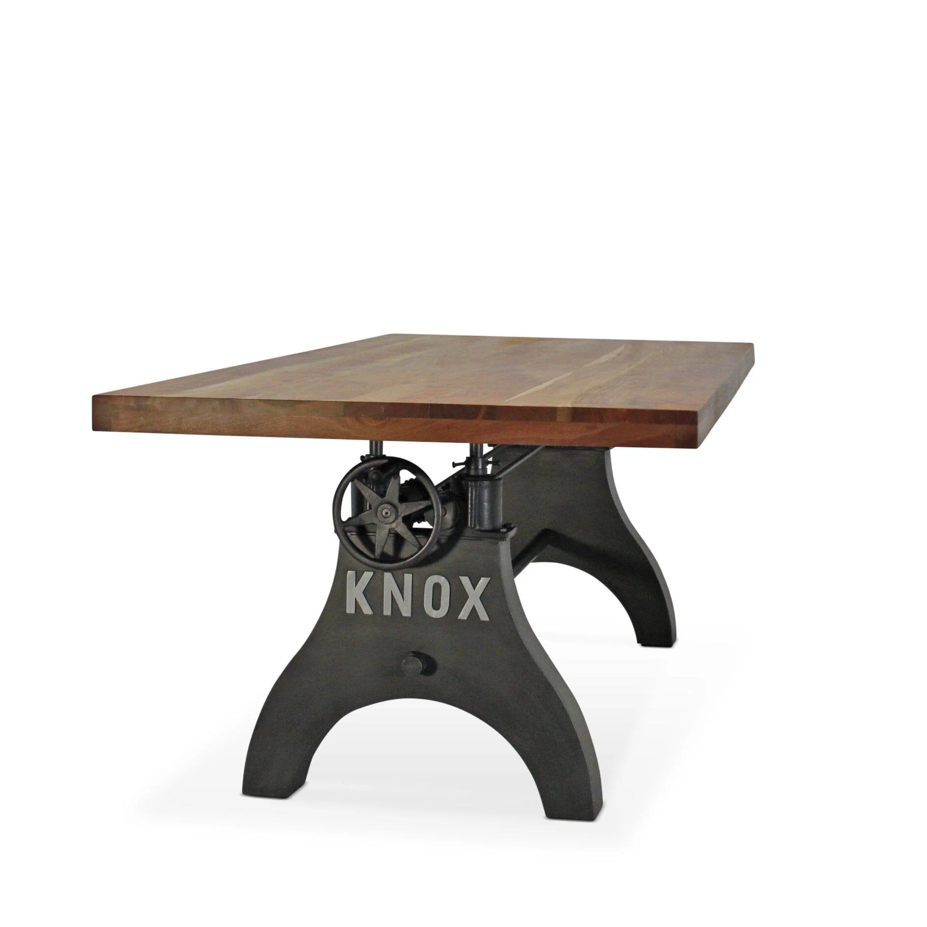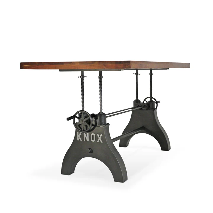 This impressive, handcrafted, piece was inspired by the sturdy machinery used in factories during the heyday of the American Industrial Revolution. Heavy gauge steel with cast iron mechanical crank system with a solid acacia hardwood top come together to create this rugged, yet handsome, eye-grabber. We are located in Knoxville, Knox County, Tennessee, and we created this unique cast-iron design and embossed it KNOX to reflect our love of the area.
