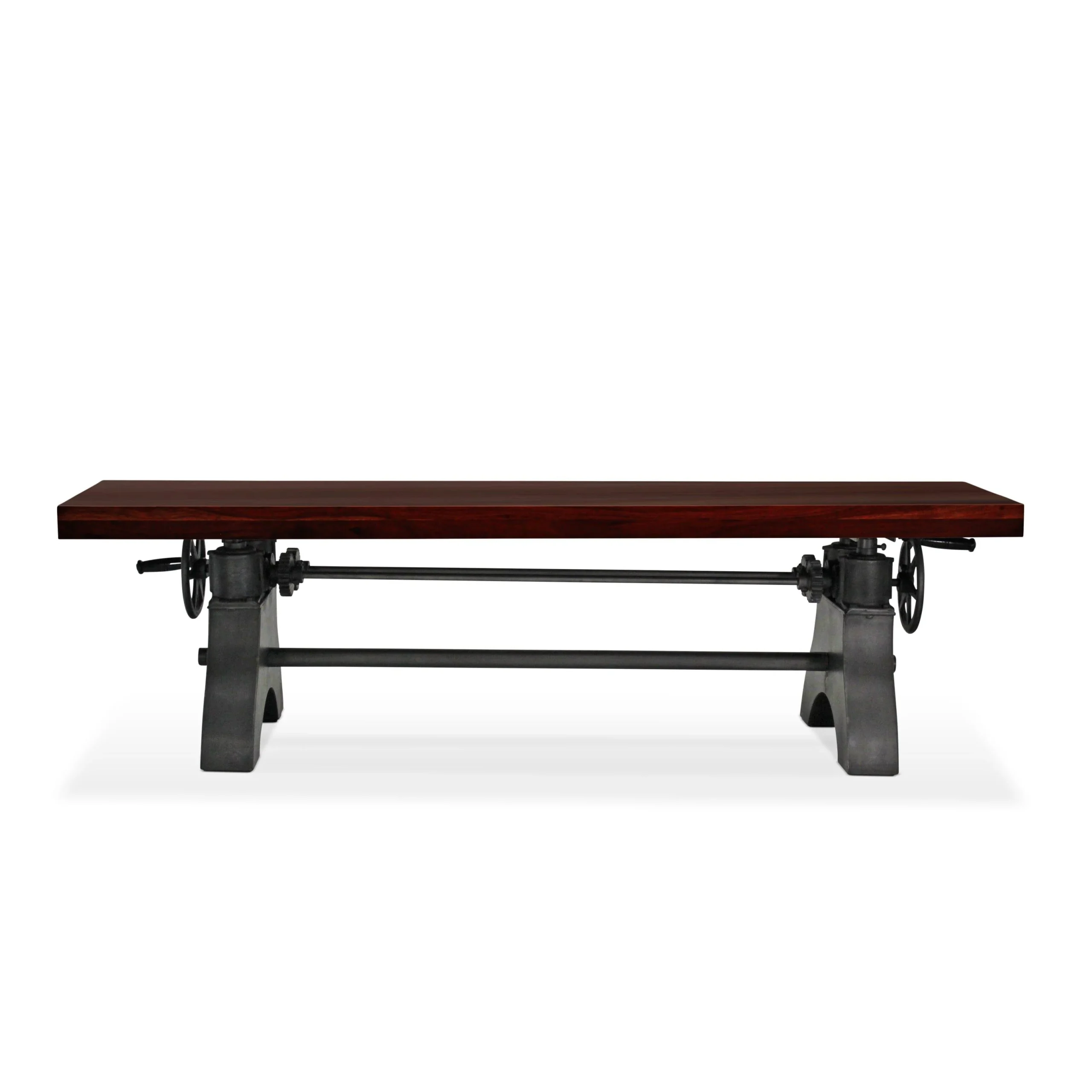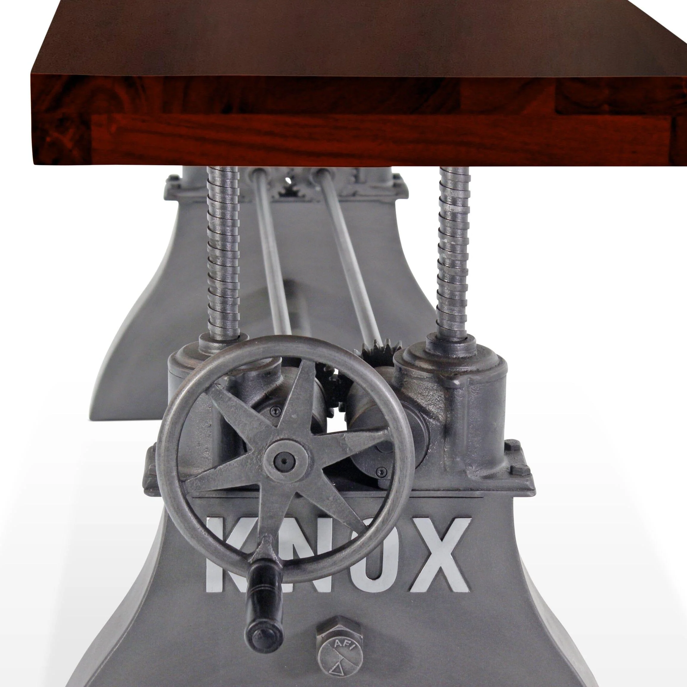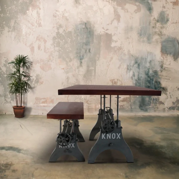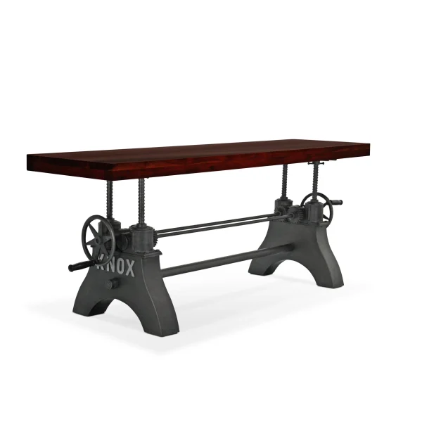 Inspired by the amazing machining done during the heyday of the Industrial Revolution, our KNOX table combines cast iron and steel to form a clean industrial eye-grabber. The valve-wheel crank effortlessly raises and lowers the bench top through a 7-inch range.
