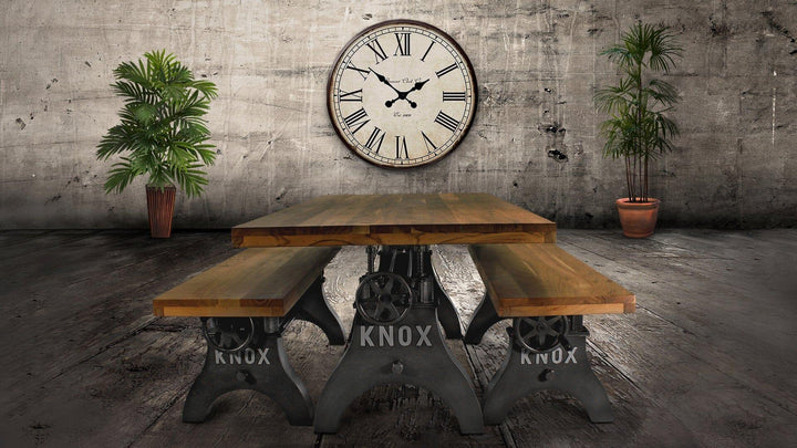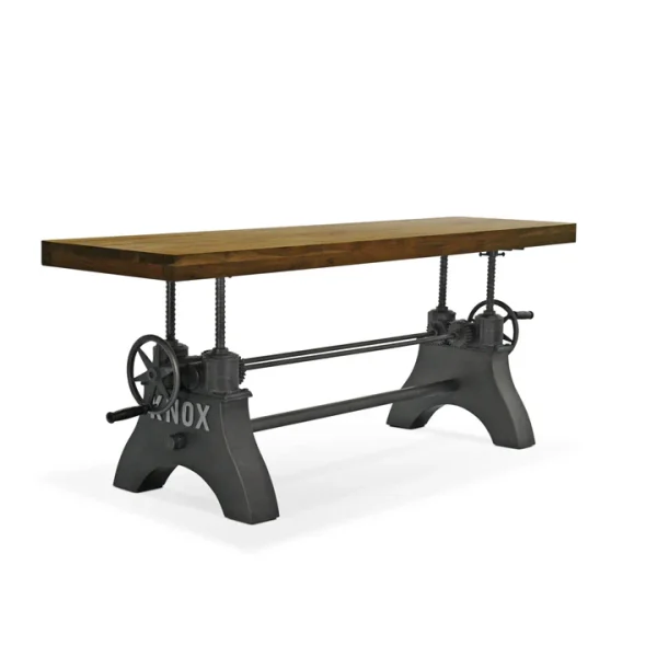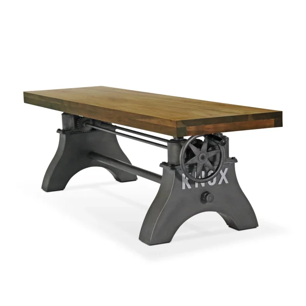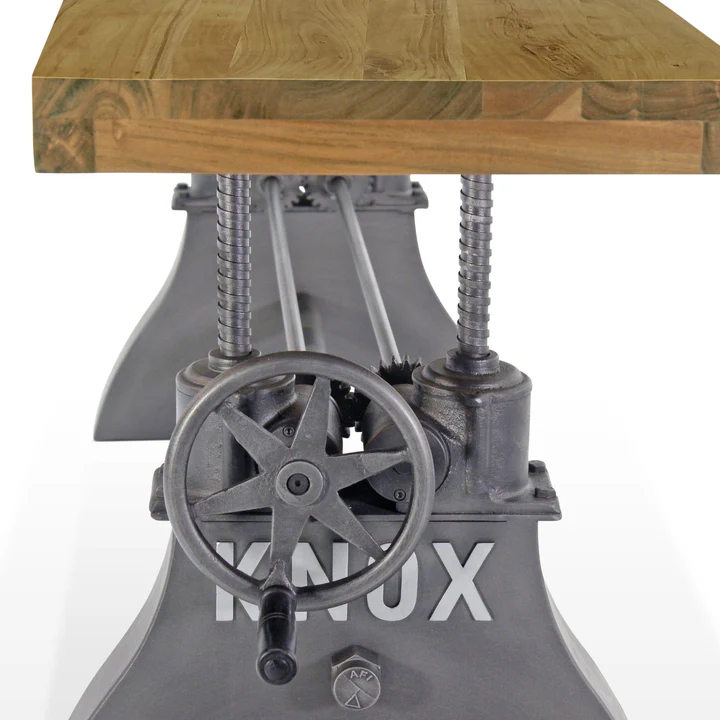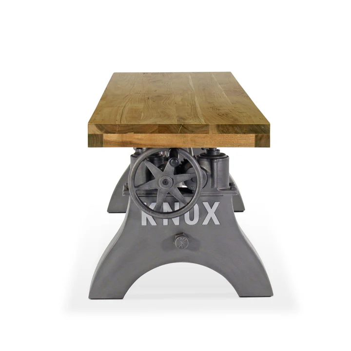 Inspired by the amazing machining done during the heyday of the Industrial Revolution, our KNOX table combines cast iron and steel to form a clean industrial eye-grabber. The valve-wheel crank effortlessly raises and lowers the bench top through a 7-inch range.