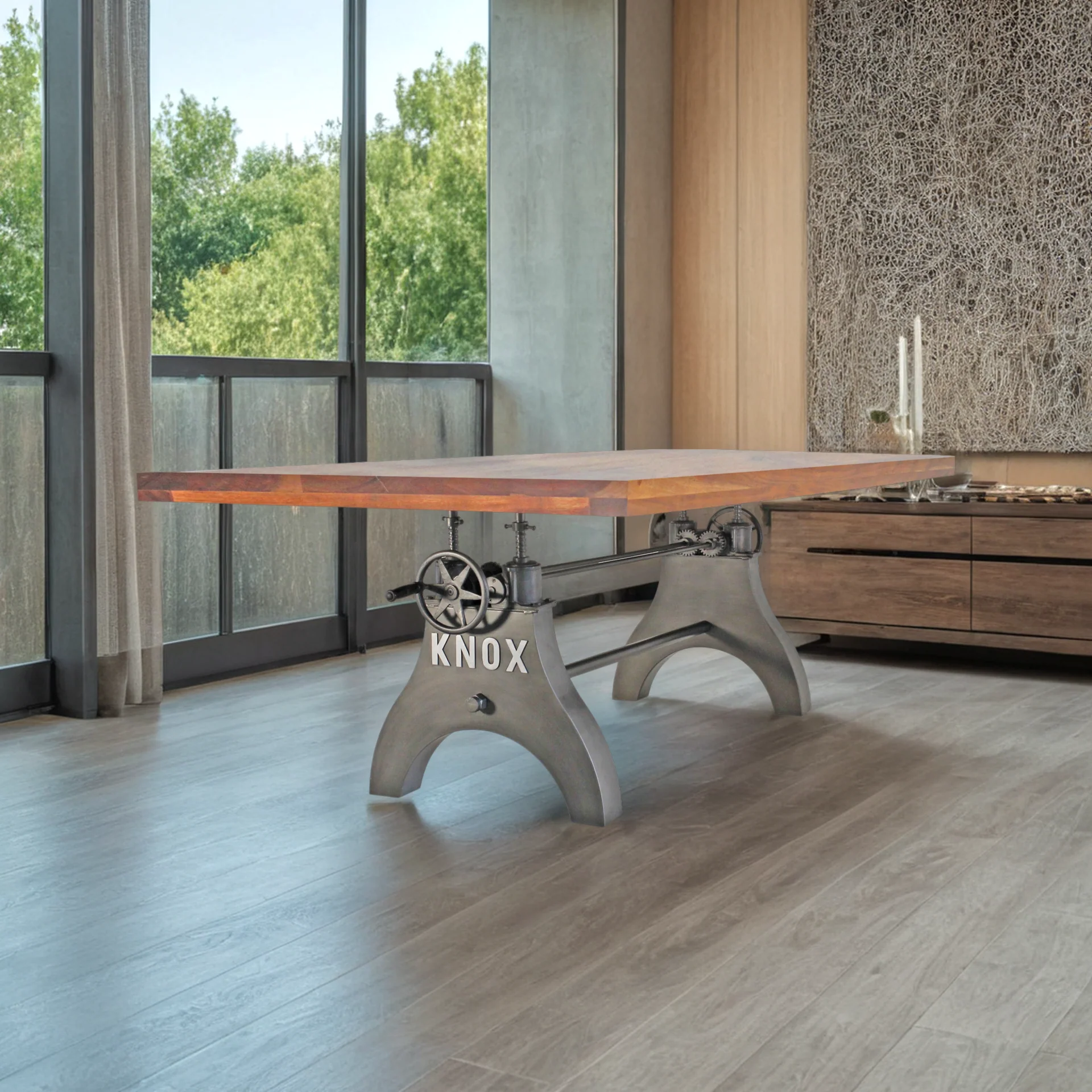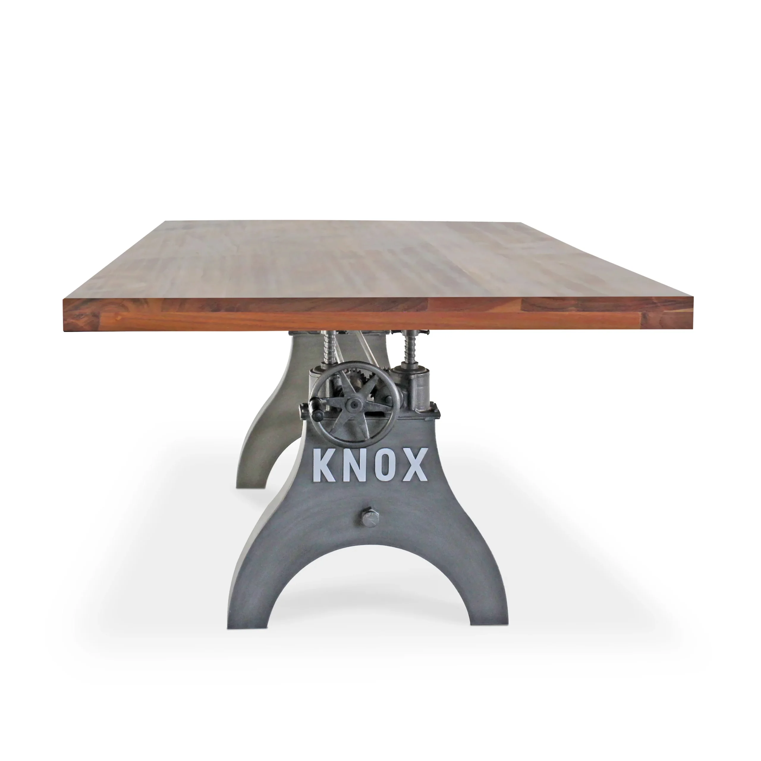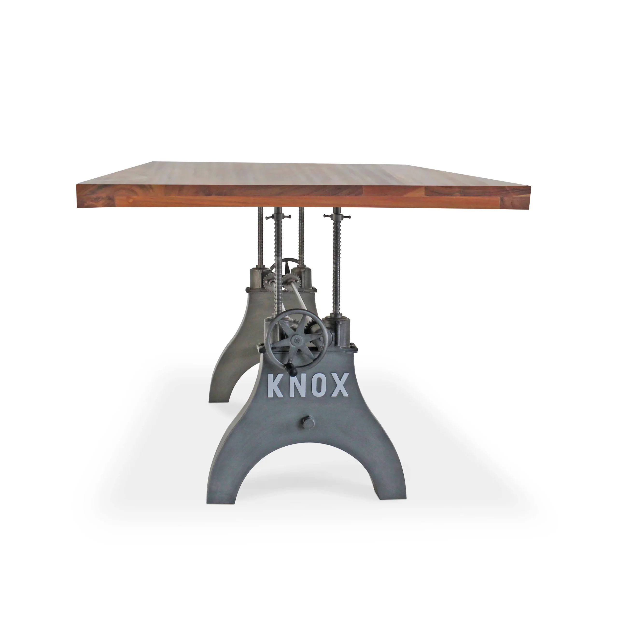 No matter the dining situation, this beautifully designed industrial table will fill the need. Our KNOX dining table has a hand-crank iron wheel allowing you to move the massive solid acacia tabletop effortlessly through a 10-inch range, from standard dining height all the way to counter or bar pub height.