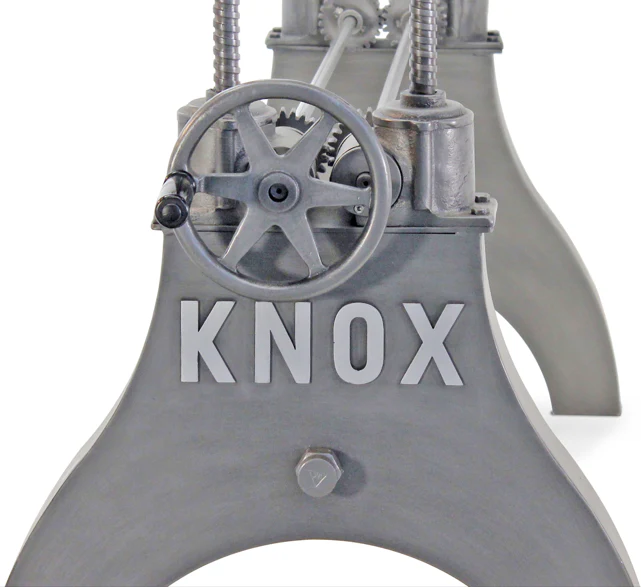 This impressive, handcrafted, piece was inspired by the sturdy machinery used in factories during the heyday of the American Industrial Revolution. Heavy gauge steel with cast iron mechanical crank system with a solid acacia hardwood top come together to create this rugged, yet handsome, eye-grabber. We are located in Knoxville, Knox County, Tennessee, and we created this unique cast-iron design and embossed it KNOX to reflect our love of the area.
