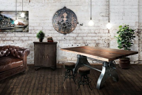 No matter the dining situation, this beautifully designed industrial table will fill the need. Our KNOX dining table has a hand-crank iron wheel allowing you to move the massive solid reclaimed hardwood tabletop effortlessly through a 10-inch range, from standard dining height all the way to counter or bar pub height.