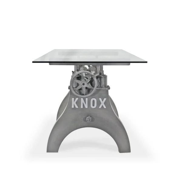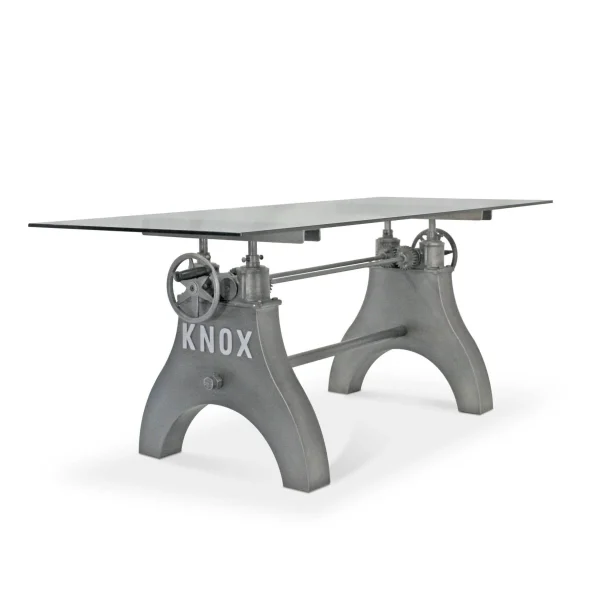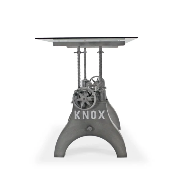 No matter the workspace situation, this beautifully designed industrial writing table will fill the need. Our KNOX desk has a hand-crank iron wheel allowing you to move the elegant glass tabletop effortlessly through an 11-inch range, from standard desk height all the way to an ergonomic standing height of 40 inches. This impressive, handcrafted, piece was inspired by the sturdy machinery used in factories during the heyday of the American Industrial Revolution. Cast iron, forged steel and glass top come together to create this rugged, yet handsome, eye-grabber. We are located in Knoxville, Knox County, Tennessee, and we created this unique cast-iron design and dubbed it KNOX to reflect our love of the area. – Clear tempered 1/4 inch thick glass top with smooth rounded edges – Dimensions (inches): 72W x 30D x 29-40H. – Cast iron base size