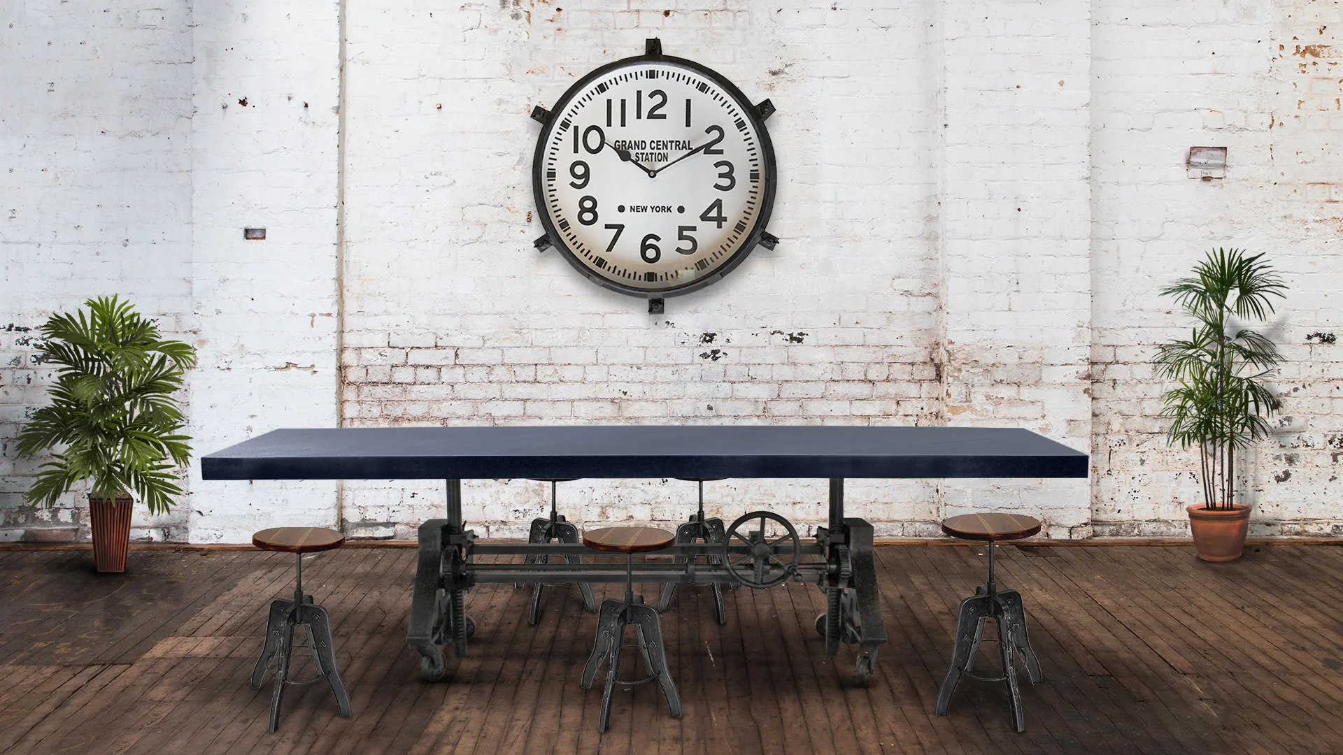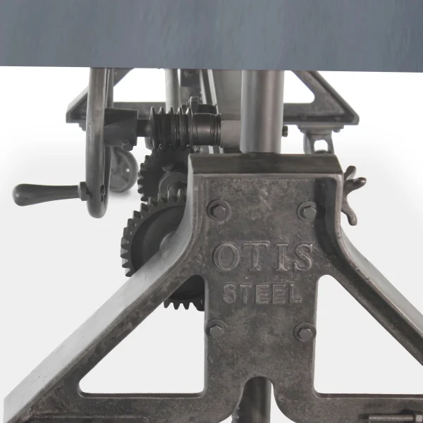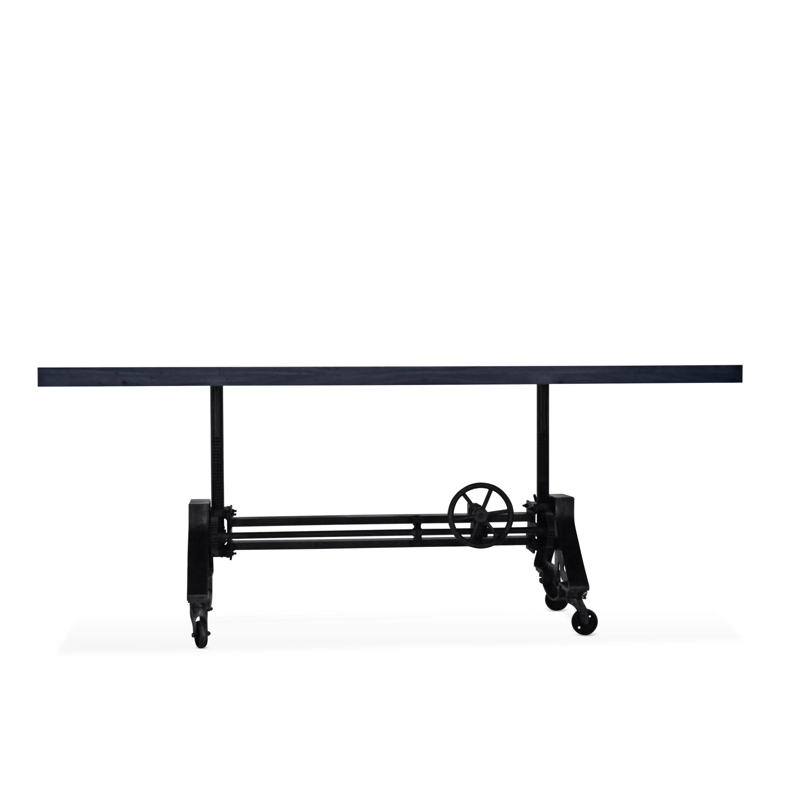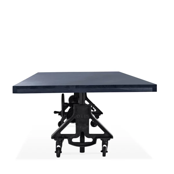 Established during the US Industrial Revolution, Otis Steel was a crucial part in Cleveland’s manufacturing history from 1875 to 1942. Inspired by the distinctive industrial lines characteristic of the gantry pivots and furnace-ladle arms of the Otis metal-works factory, the muscular cast-iron base provides a robust foundation for this handcrafted, adjustable-height industrial dining table or desk.