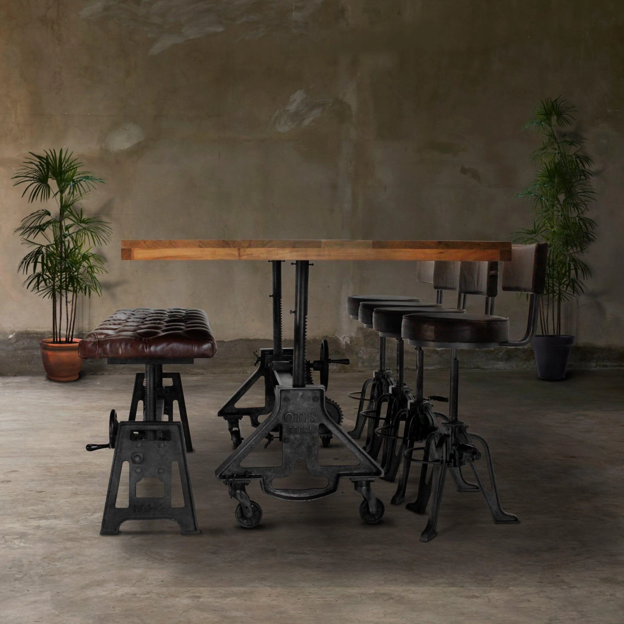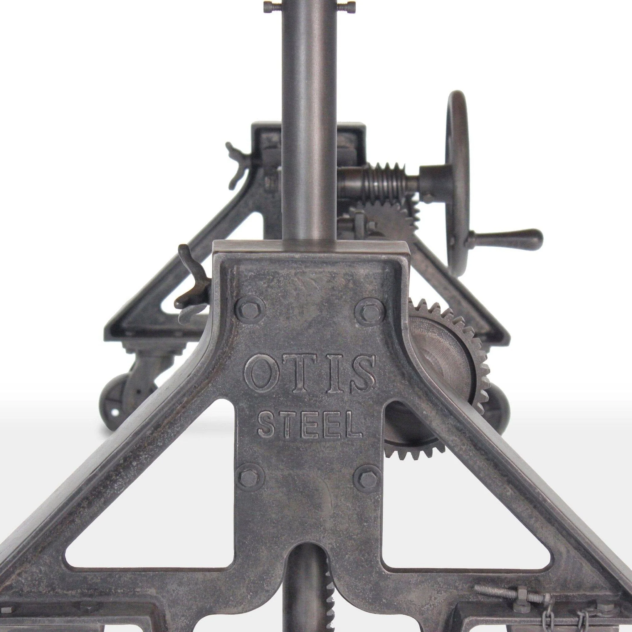 Established during the US Industrial Revolution, Otis Steel was a crucial part in Cleveland’s manufacturing history from 1875 to 1942. Inspired by the distinctive industrial lines characteristic of the gantry pivots and furnace-ladle arms of the Otis metal-works factory, the muscular cast-iron base provides a robust foundation for this handcrafted, adjustable-height industrial dining table or desk.